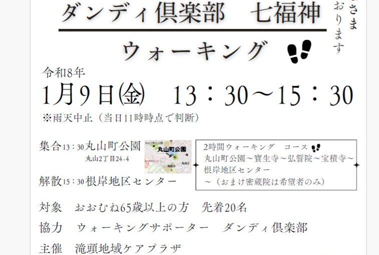 新年1月9日金曜日14:00から磯子七福神のハーフコースを歩きます!!みなさんのご参加を是非お待ちしております。歩きに自信がない皆さんも大丈夫ですよ。ウォーキングサポーターのダンディ倶楽部さんと一緒に、優しいウォーキングです。13:30 #丸山町公園 集合#寶生寺~#弘誓院~#宝積寺~#根岸地区センター 解散15;30(おまけ希望者のみ密蔵院)お申込みは滝頭ケアプラザまで!(電話または来館)#磯子七福神 #2時間ウォーキング #歴史 #ダンディ倶楽部 #ウォーキング #初詣 #横浜市滝頭地域ケアプラザ #介護予防 #フレイル予防