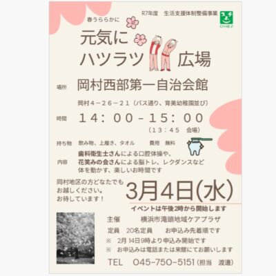 必見3月4日14時からの「ハツラツ広場」は磯子区在宅歯科医療連携室の歯科衛生士さんなどによる”噛むチカラ”のチェックやお口の体操などをしてもらえます!なかなか聞けないお話もいっぱいです!!また、フレイル予防サポーター「花笑みの会」さんによる体と頭の運動の楽しいお時間も用意しております春めいてきた町へ皆さんお出かけしてきませんか。お待ちしております。う。予約制となっております、滝頭地域ケアプラザまで、来館またはお電話でお申込みください。してくださいます!#フレイル予防 #オーラルフレイル #いつまでも住み慣れた町で #元気な生活を #噛むチカラ #コグニサイズ #脳トレ #横浜市 #横浜市滝頭地域ケアプラザ #横浜市磯子区岡村 #顔の見える関係づくり #高齢者サロン #地域サロン #花笑みの会 #岡村西部第一自治会館 #春